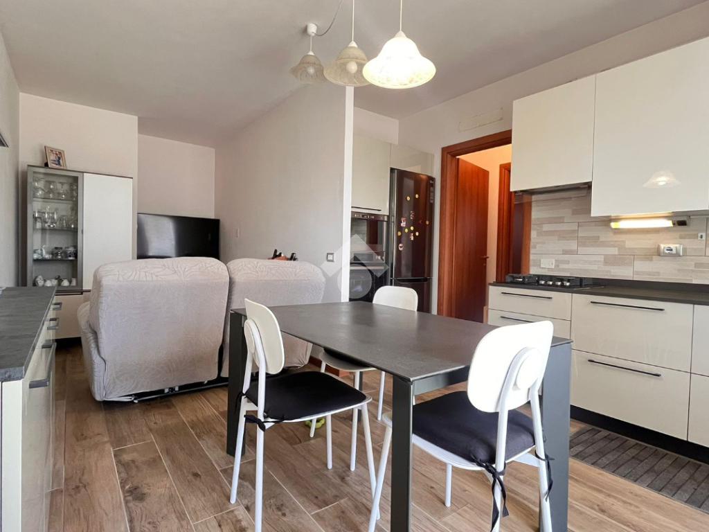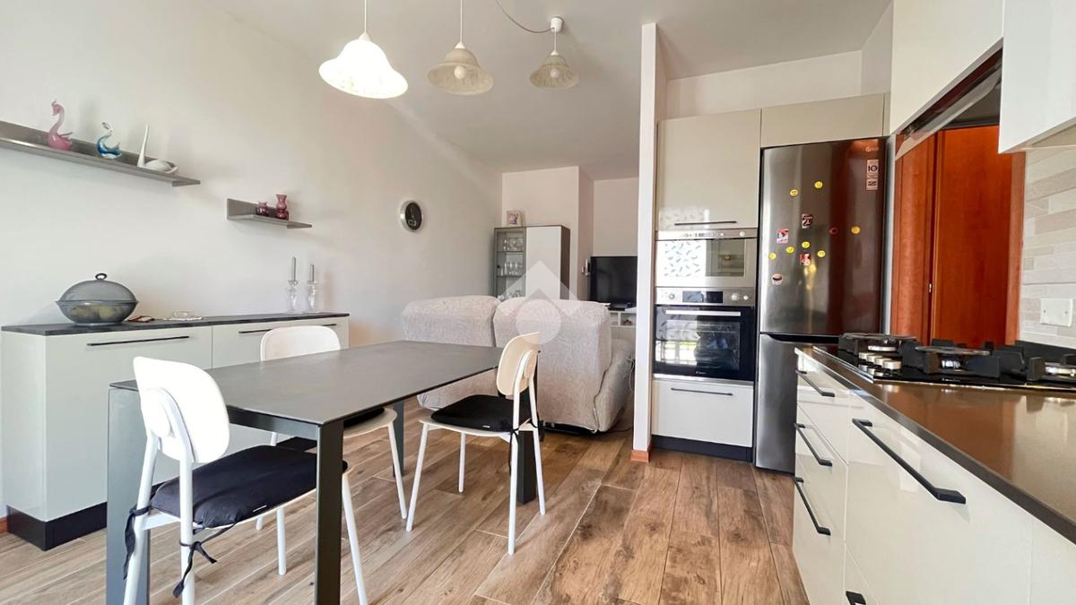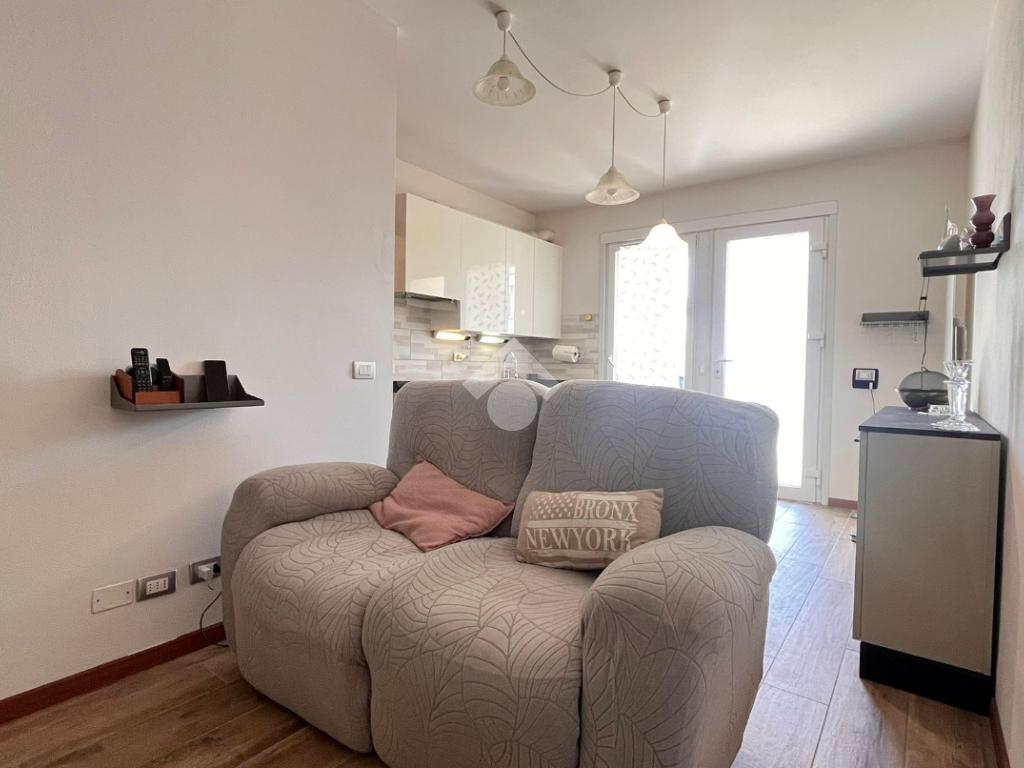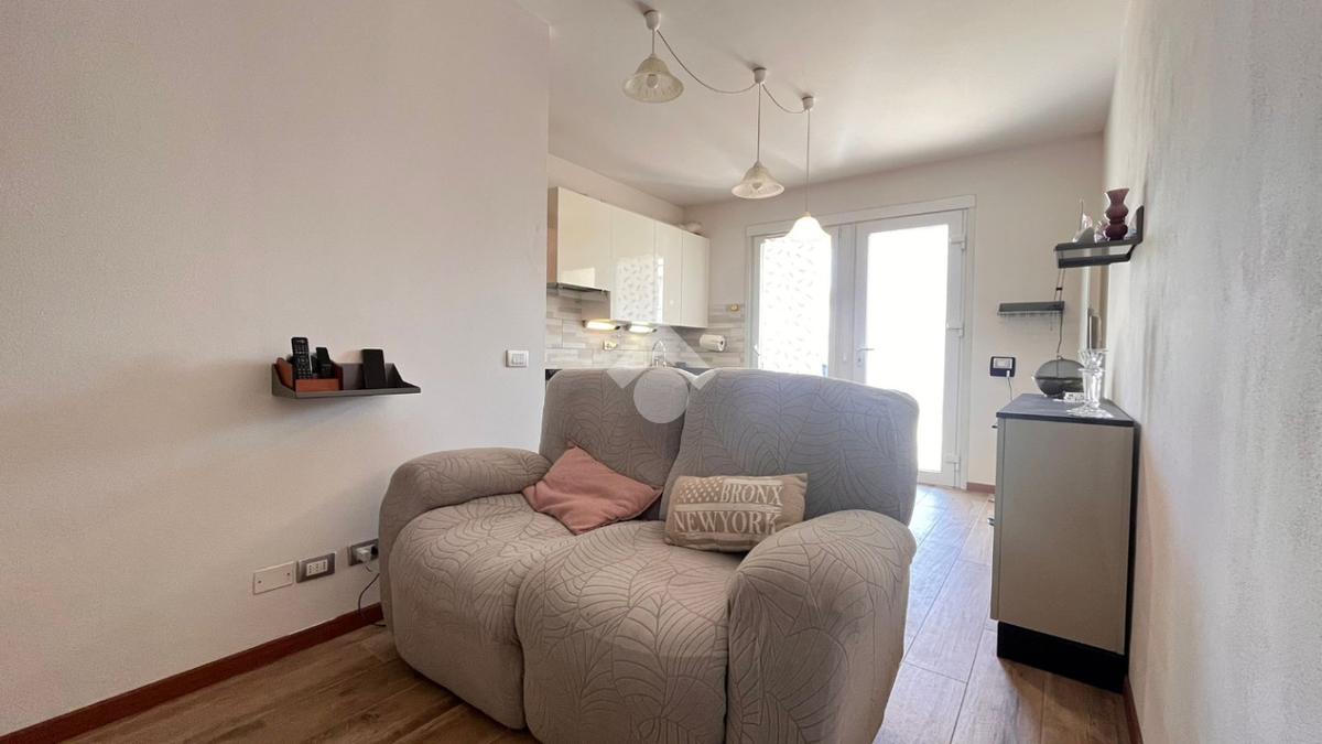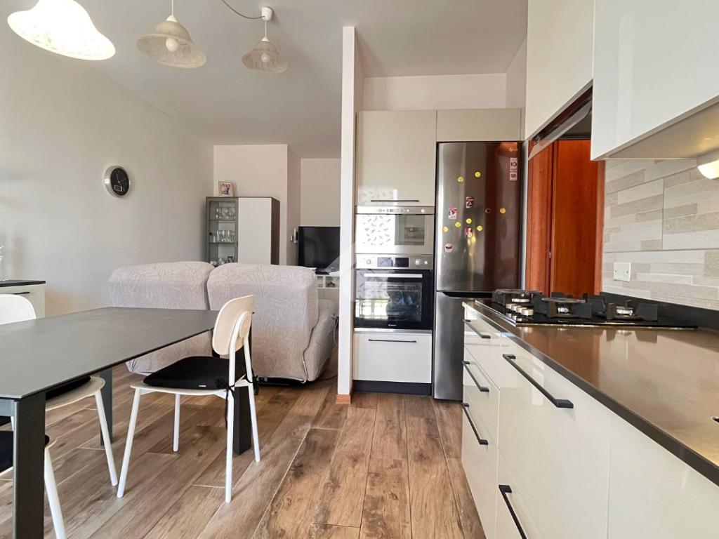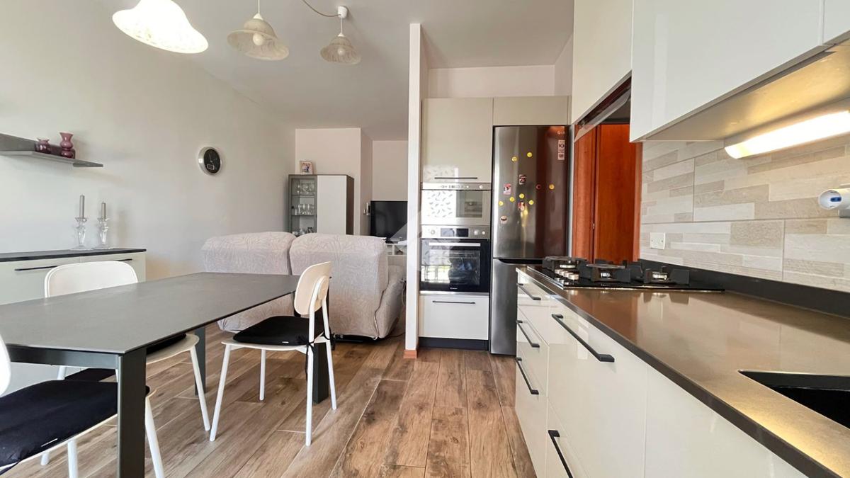 L’ingresso si apre su una luminosa zona living con cucina a vista, dove ogni dettaglio è pensato per offrire comfort e funzionalità.